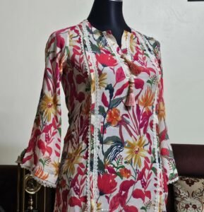 This outfit is crafted from premium crepe soft silk cotton, ensuring a perfect blend of comfort and sophistication. The breathable and lightweight material makes it your go-to choice for humid summer days, allowing you to stay cool and confident.
