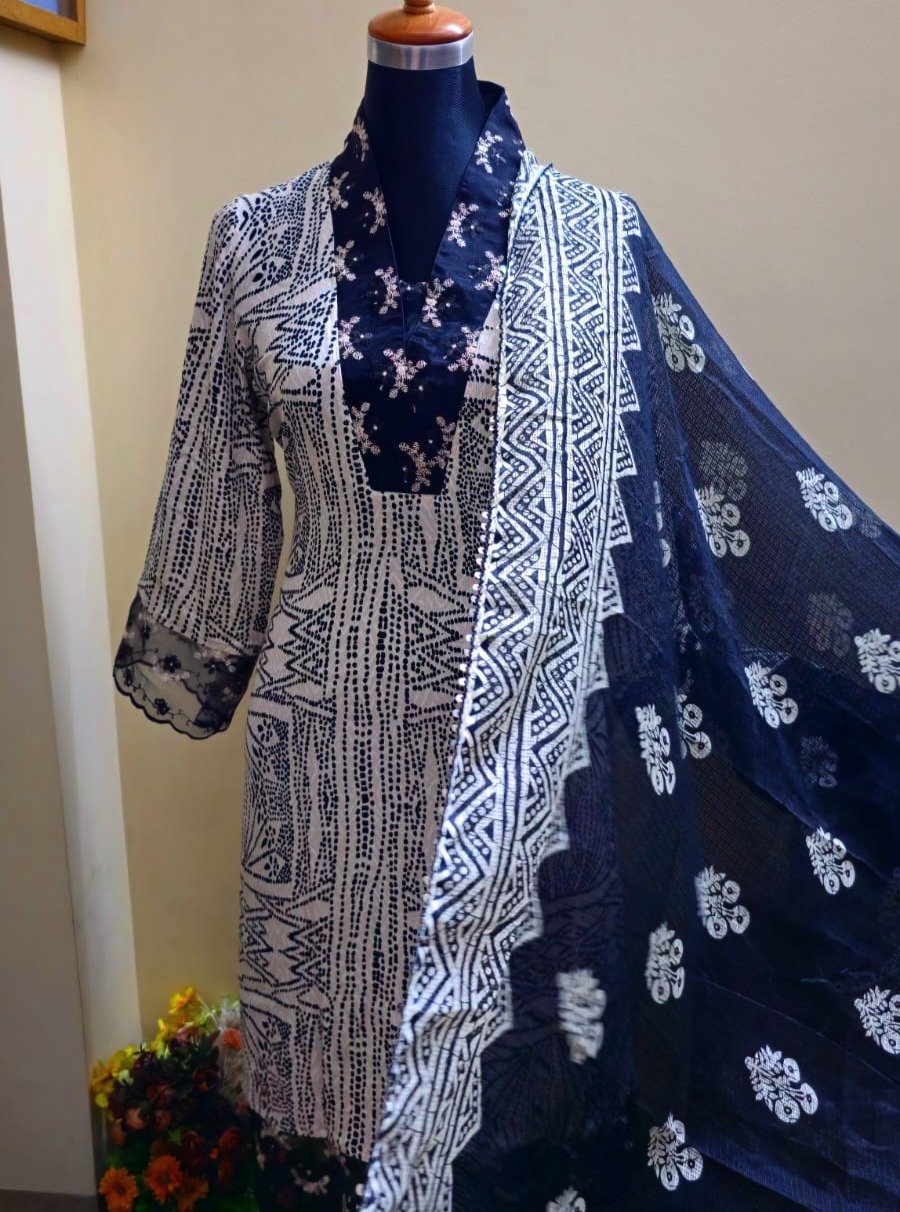Complete the look with a beautifully patterned Cota fabric Orna. This exquisite pairing harmonizes contemporary prints and traditional artistry, making this kurta set a true masterpiece of timeless appeal and impeccable quality.